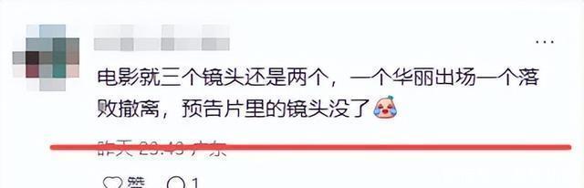 刚想说演的是多重的角色,网友的评论让人笑不活了: 里面的镜头也就两三个,一个华丽出场,一个落败撤离,预告片的镜头还被“一剪没”。